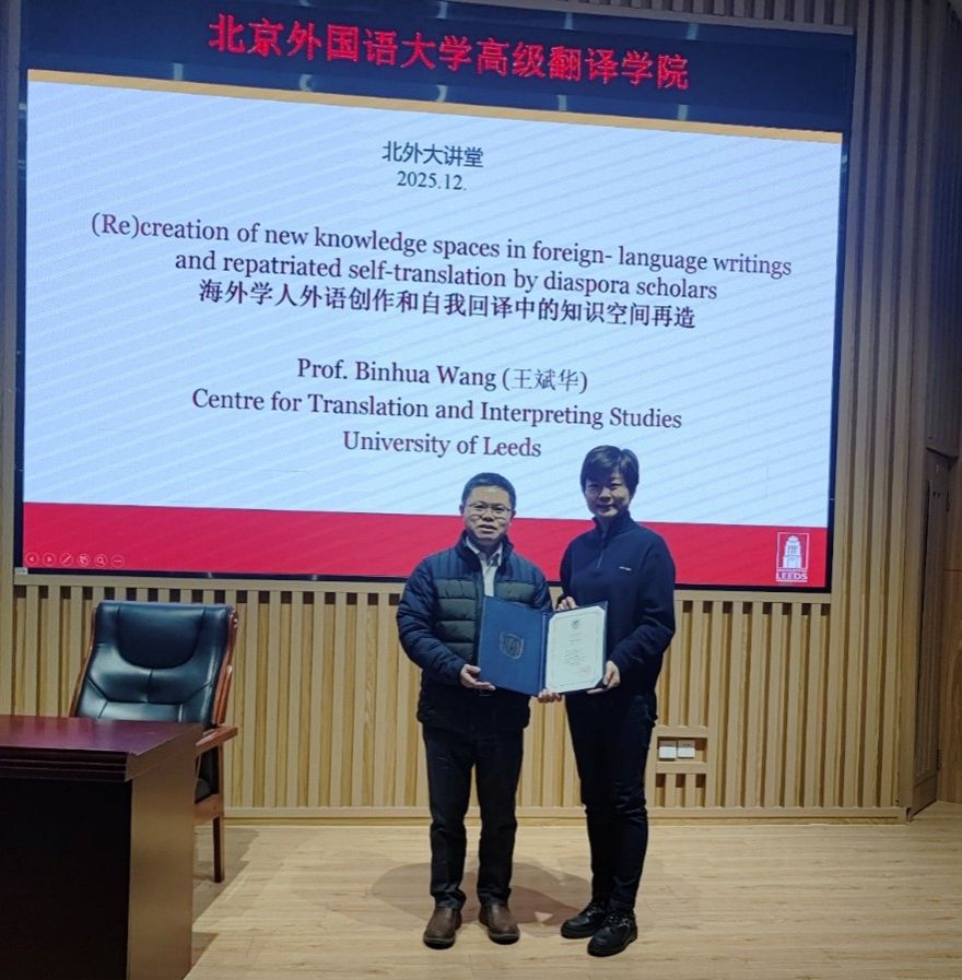 2025年12月1日晚,英国利兹大学王斌华教授应邀做客北外大讲堂,以“海外学人外语创作和自我回译中的知识空间再造”为题展开深度分享。讲座开始前,beat365中国唯一官方网站党总支书记王薇薇为王斌华教授颁发了冠名讲席教授证书。讲座由院长任文教授主持。 讲座伊始,王斌华教授以亲切的自我介绍拉近了与高翻学子的距离。他分享了自己与翻译结缘的三重身份:自1998年起自学并投身口译实践的一线译员;培养二十余届会议口译员的教师;自2006年攻读博士学位以来,...