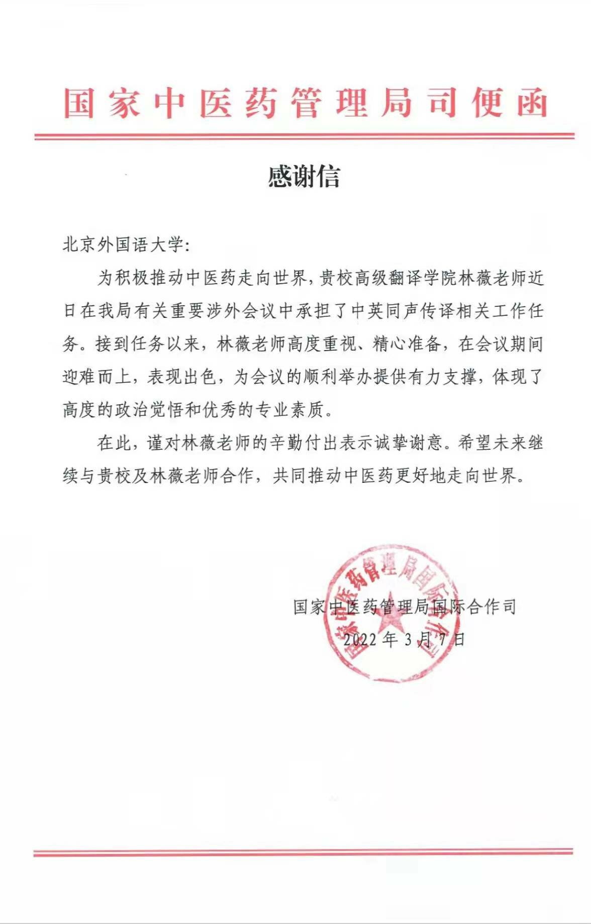 beat365官网收到国家中医药管理局感谢信近日,beat365官网收到国家中医药管理局发来的感谢信,信中对beat365中国唯一官方网站教师林薇博士在其会议同声传译相关工作提供的支持表示感谢,同时对林薇出色的表现给予了高度评价。感谢信内容如下: