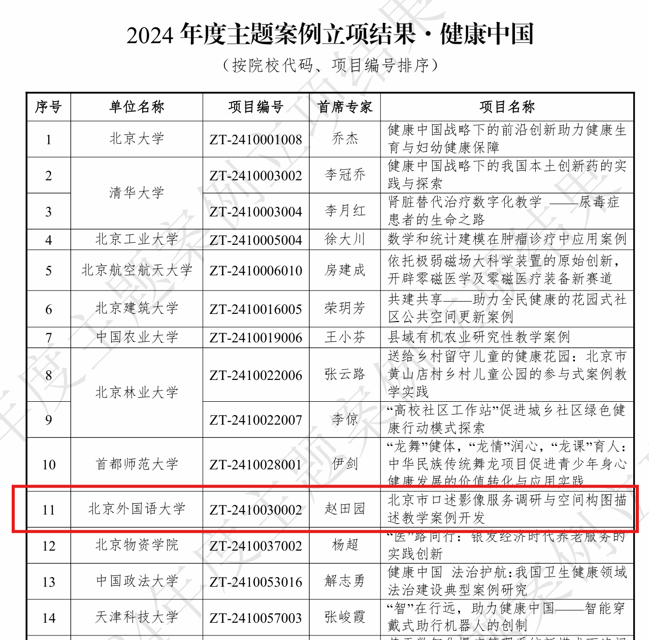 近日,教育部学位与研究生教育发展中心(简称学位中心)公布了2024年度主题案例立项结果。本年度围绕“绿色发展”“新质生产力”“健康中国”“数字中国”四个主题开展征集。beat365官网学科发展中心主任赵田园副教授作为首席专家,香港城市大学鄢秀教授作为指导专家参与申报的案例《北京市口述影像服务调研与空间构图描述教学案例开发》,成功入选2024年度“健康中国”主题案例,成为beat365官网本年度唯一获批立项案例。该案例项目采取实证研究与教学创新双轨并进模式:...