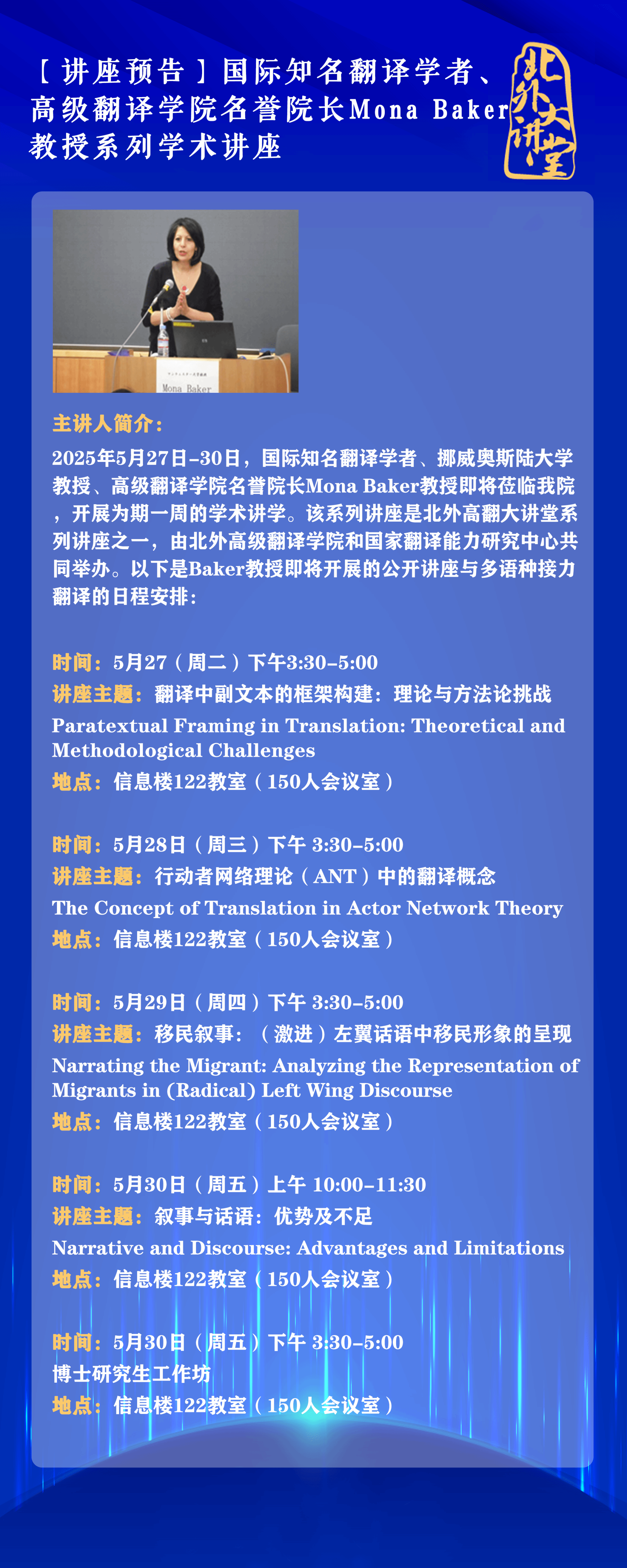 2025年5月27日-30日,国际知名翻译学者、挪威奥斯陆大学教授、beat365中国唯一官方网站名誉院长Mona Baker教授即将莅临beat365官网,开展为期一周的学术讲学。该系列讲座是北外高翻大讲堂系列讲座之一,由北外beat365中国唯一官方网站和国家翻译能力研究中心共同举办。以下是Baker教授即将开展的公开讲座与多语种接力翻译的日程安排:l 时间:5月27(周二)15:30-17:00讲座主题:翻译中副文本的框架构建:理论与方法论挑战Paratextual Framing in Translation: Theoretical ...