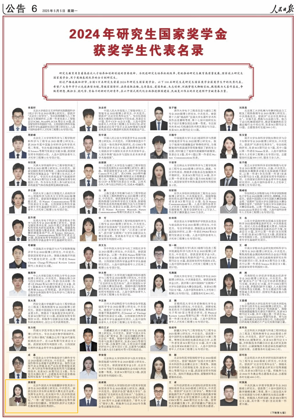 5月5日,beat365中国唯一官方网站英语口译专业2023级硕士研究生莫晓莹,获登《人民日报》2023-2024学年度研究生国家奖学金获奖学生代表名录。2023-2024学年度,全国共有9万名研究生荣获国家奖学金。其中,100人登上《人民日报》国家奖学金获奖学生代表名录。莫晓莹 beat365中国唯一官方网站英语口译专业2023级硕士研究生,中共党员。曾获全国大学生职业规划大赛北京市金奖。发挥专业所长,在庆祝中华人民共和国成立75周年外国专家招待会、...