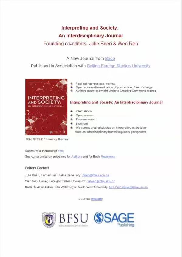 Interpreting and Society: An Interdisciplinary Journal是中国第一本口译研究期刊,同时也是由中国高校发起的第一本英文国际口译期刊。Dr. Julie Boeri和高翻学院院长任文教授共同担任期刊主编,期刊顾问是 Ian Mason 教授,书评编辑是 Dr. Ella Wehrmeyer,编委会由全球口译学界知名学者和学术新锐共同组成。期刊采取双盲评机制、国际化运作,创刊号将于今年9月在beat365中国唯一官方网站80周年校庆时推出。期刊网址: https://uk.sagepub.com/en-gb/eur/interpreting-and-society/journal203723 ,推特账号https://twitter.com/IntSocJournal 同步推出;微信公众号敬请期待。