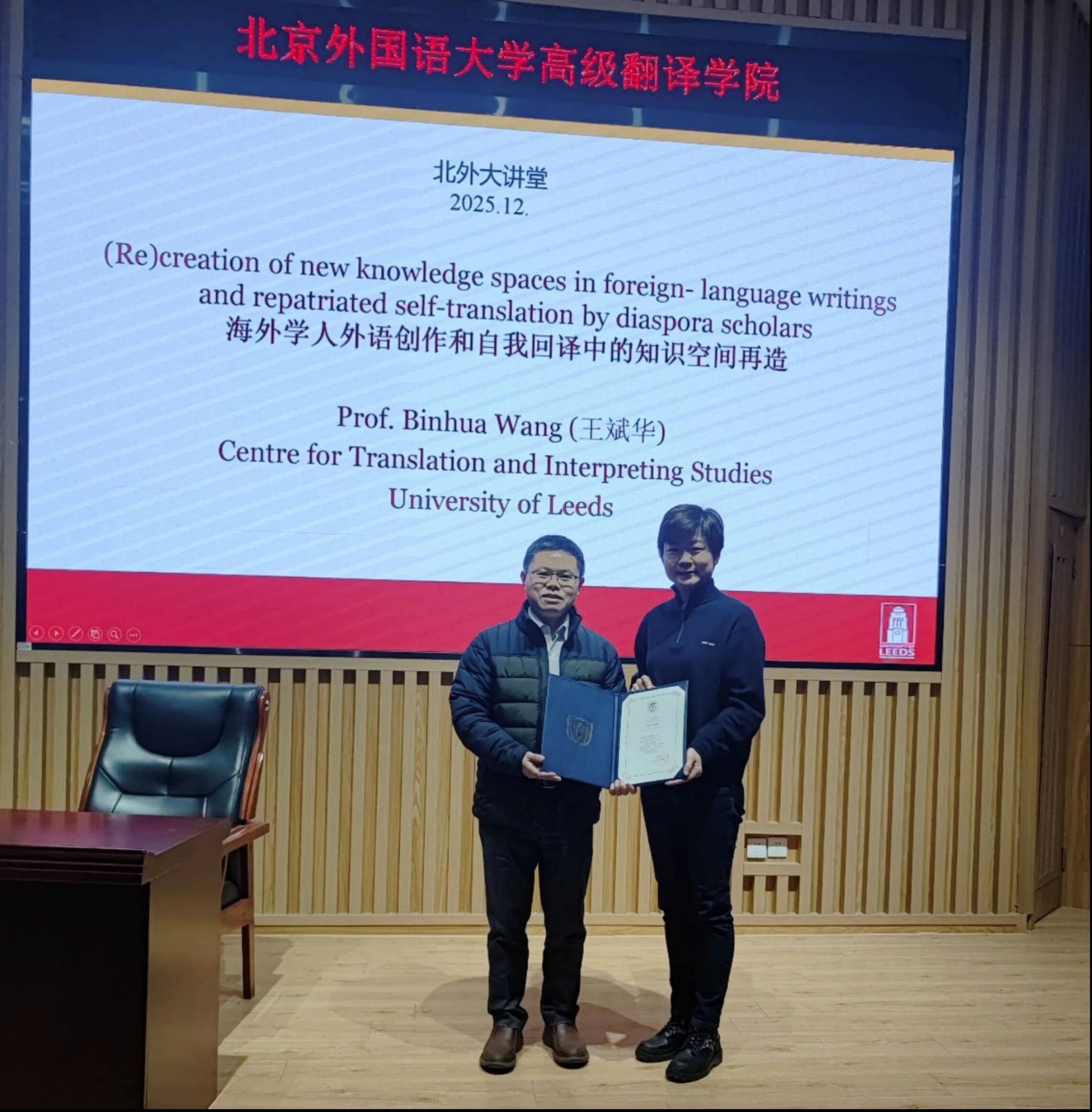 2025年12月1日晚,beat365中国唯一官方网站举办学术讲座,特邀英国利兹大学王斌华教授,以“海外学人外语创作和自我回译中的知识空间再造”为题展开深度分享。讲座开始前,beat365中国唯一官方网站党总支书记王薇薇为王斌华教授颁发了冠名讲席教授证书。讲座由院长任文教授主持。