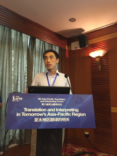 2016年6月17-18日,由国际翻译家联盟与中国翻译协会联合主办,西安外国语大学承办的第八届亚太翻译论坛举行,来自32个国家和地区的500余名翻译各领域的专家学者参加本次会议。副院长姚斌在大会平行论坛“口译教学与职业发展”上发表了题为:“Applying Case Method to teaching interpreter ethics”的演讲,重点介绍了如何在口译教学中开展译员职业伦理教育。在传统的口译教学模式中,将口译技能与领域知识作为教学重点,对译员职业伦理的关注不足。他指出,职业伦理意识是译员从事口译实务时必备素养,而应用案例教学法对口译学习者开展职业伦理教育是沟通口译课堂与口译实践的重要纽带。他向大会提交的论文:“口译课堂中的案例教学——实践与思考”已被大会论文集“亚太翻译的未来”收录。