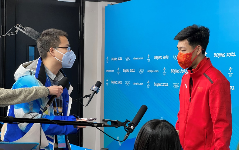 欣逢盛事凭国力,且看龙凤借青云。在许多高光时刻,最难忘的要算给中国队接受采访提供口译服务了。转播混采区是运动员下场后经过的第一个区域,也是语言服务志愿者工作的主要场所之一。全力以赴后的运动员们往往都气喘吁吁,声音也比较小,这些都给采访翻译增加了不少难度。还有一层紧张来自运动员们的“光环”。当看到这些平时只能在电视上见到的偶像此时此刻就在眼前听自己翻译记者的提问,内心更是激动不已。虽然手心微微出汗,记笔记的手微微颤抖,但是当话筒递到嘴边,一切都在掌控之中:凭借着详尽的译前准备和扎实的基本功,最终圆满地完成了口译任务,留下了与武大靖、任子威、曲春雨、孙龙等同框的珍贵照片。
