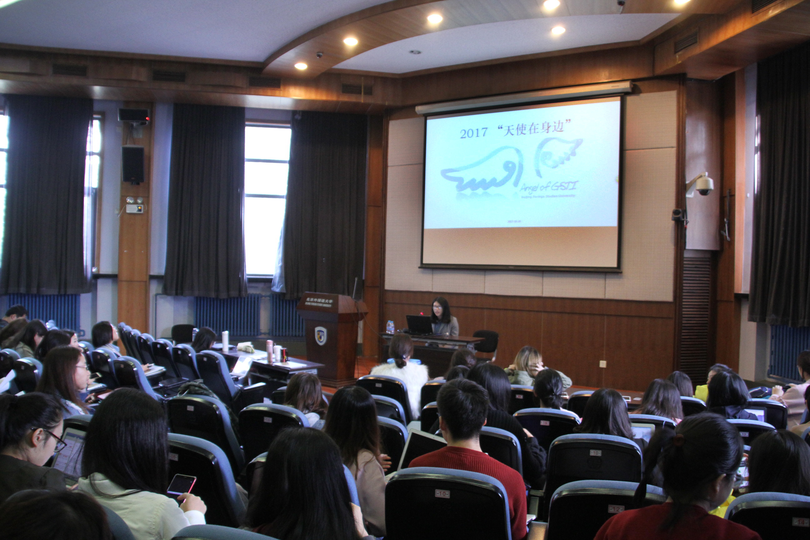 2017年10月24日,高翻学院特色暖心互助活动“天使在身边”在同学们的热切期盼中正式启动了。全体17级同学都事先将愿望和联系方式写在小卡片上,放在抽签箱里静候同学们抽取。此外,院里数位老师也受邀参加活动,与同学们一起体验“小天使“和”小主人“的奇妙身份。活动现场非常热闹,按捺不住心中期待的“小天使”们排成长龙,激动地等待着认领自己即将要关心的“小主人”。