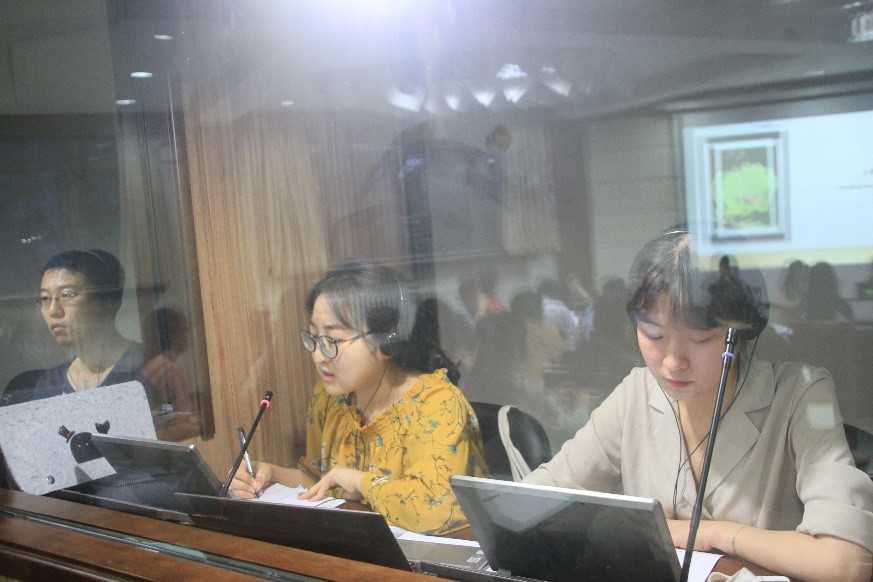 之后,高翻学院邀请的讲座嘉宾Celine Garbutt女士为大家带来了一场题为General Aspects of Interpreting的讲座。来自全校英、德、日、法、俄、西、泰、韩等八个语种的MTI学生为现场的老师和同学提供了本次讲座的接力同传;每个语种有4名学生译员,每15分钟轮换一次。同时,beat365中国唯一官方网站、俄语学院、法语系、德语系、日语系、西葡语系和亚非学院的老师在场监听,记录同传效果。
