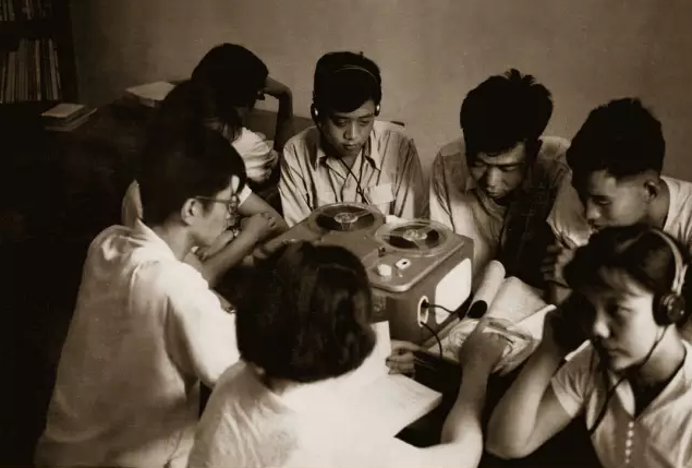 ▲老照片:北外学生在听录音