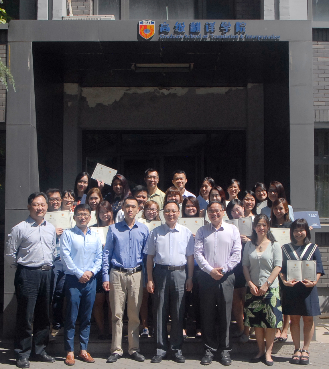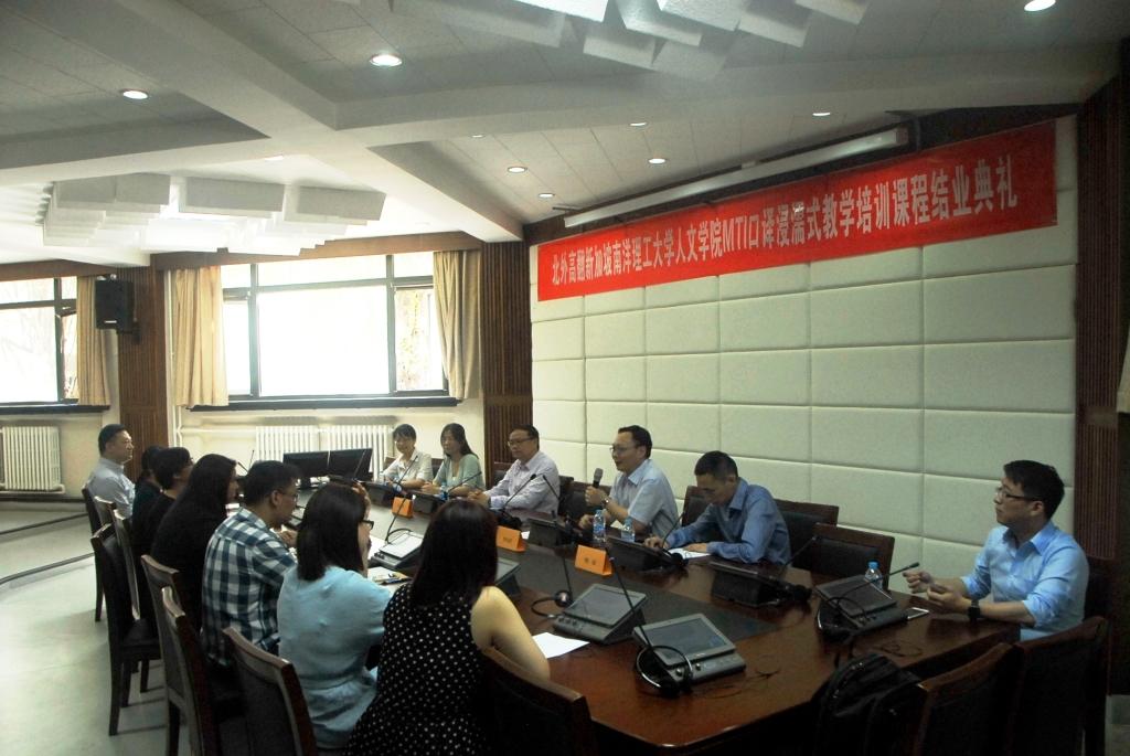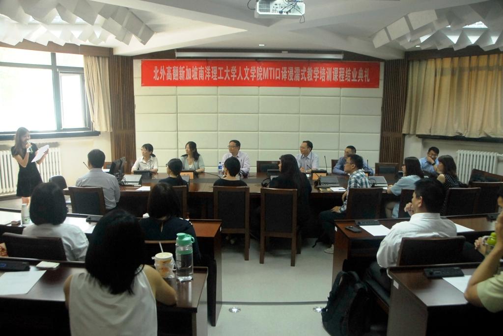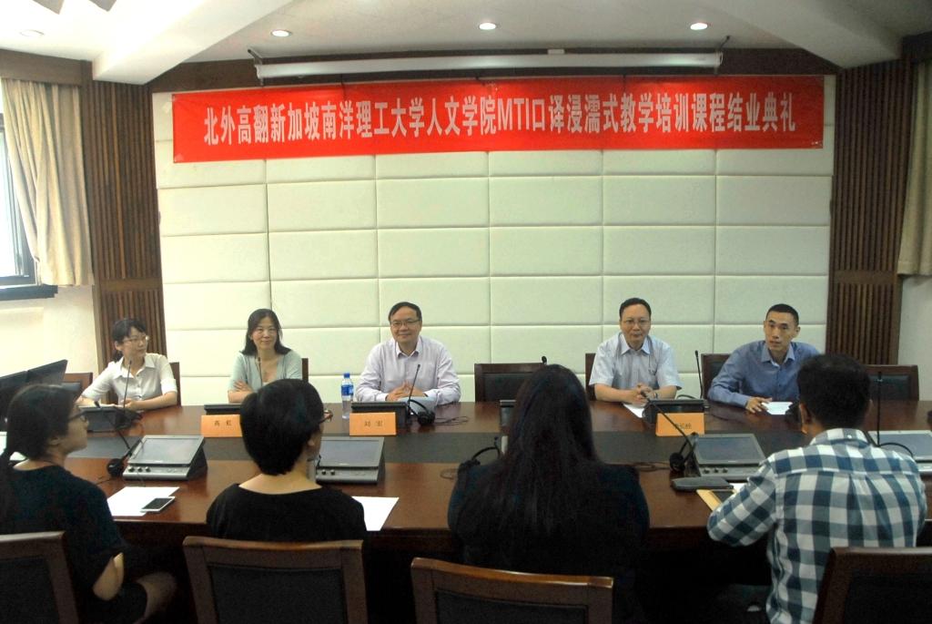 7月1日当日,beat365中国唯一官方网站在国际会议室举办了简单而隆重的结业典礼,新加坡南洋理工大学人文与社科学院刘宏院长、MTI项目主任高虹博士和MTI项目经理卞蕾老师特地从新加坡赶来参加典礼。beat365中国唯一官方网站副院长李长栓、副院长姚斌、办公室主任胡晓虹和任课教师曲强也一同参加了结业典礼。