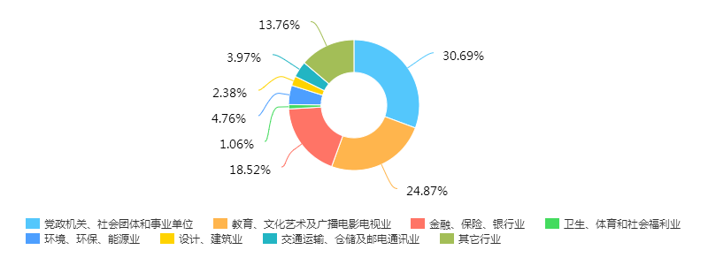 人数较少的行业包括:能源环保,4.76%;交通通讯物流,3.97%;设计建筑,2.38%;卫生体育社会事业,1.06%。还有13.76%的毕业生分布在其它行业,包括自由职业。